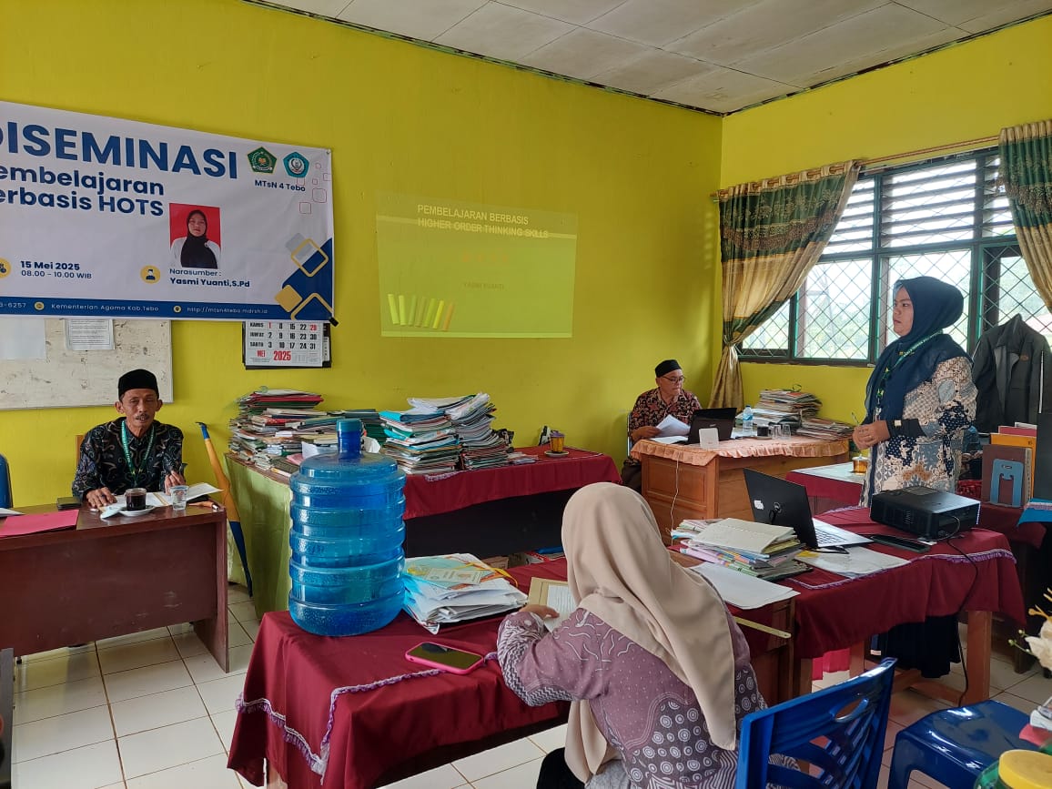 Tebo, 15 Mei 2025 - MTs Negeri 4 Tebo menggelar diseminasi pembelajaran berbasis Higher Order Thinking Skills (HOTS) yang disampaikan oleh Ibu Yasmi Yuanti, S.Pd. Kegiatan ini bertujuan untuk meningkatkan kemampuan guru-guru dalam mengembangkan pembelajaran yang berbasis HOTS.