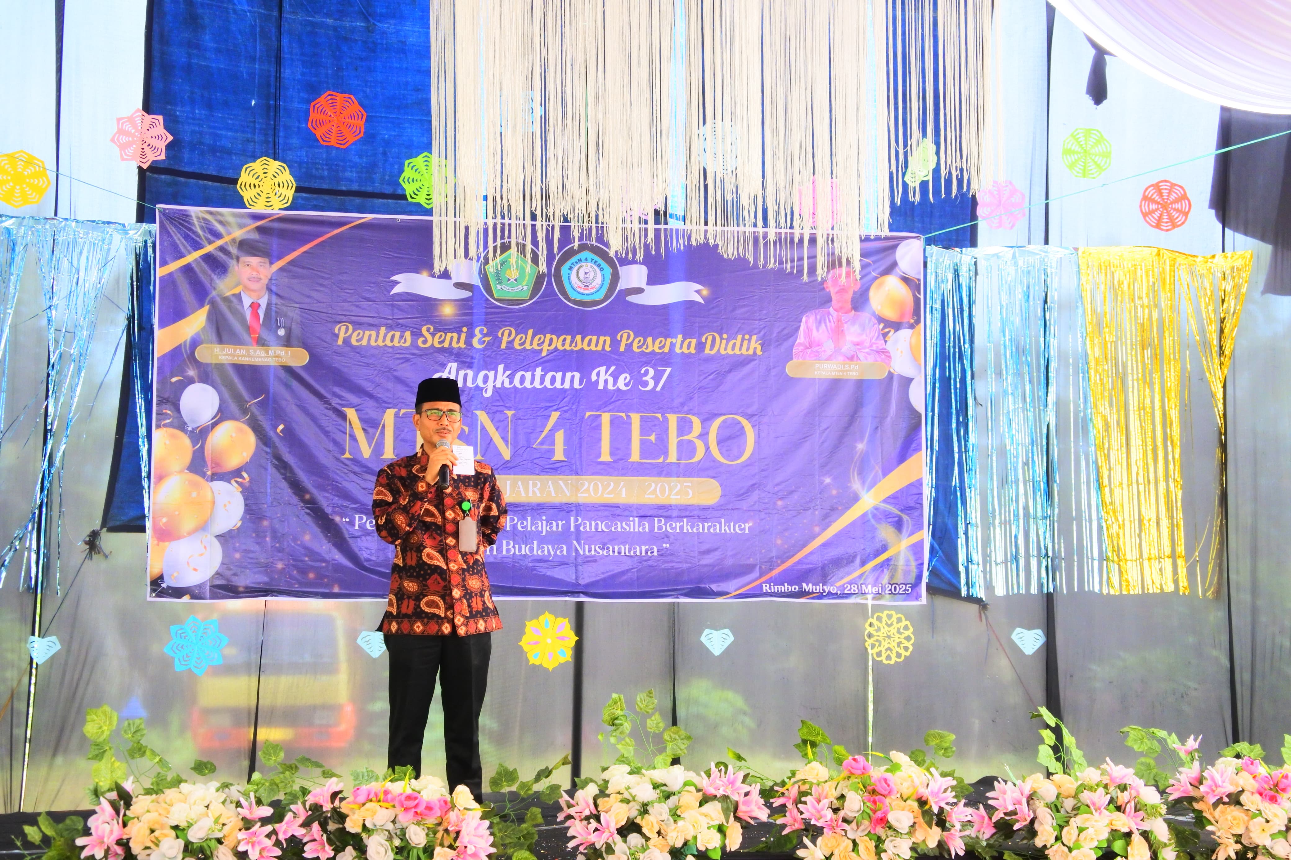 Kepala MTs Negeri 4 Tebo, Bapak Purwadi, S.Pd., menyampaikan bahwa acara pelepasan ini merupakan momen yang sangat penting bagi siswa kelas IX untuk menutup babak baru dalam perjalanan pendidikan mereka.