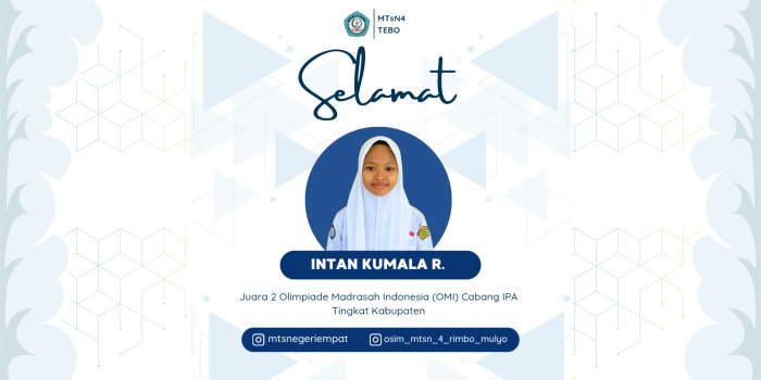 Tebo, 18 September 2025 � Kabar membanggakan kembali datang dari MTsNegeri 4 Tebo. Salah satu peserta didik berprestasi, Intan Kumala Ratih, berhasil meraih Juara 2 pada ajang Olimpiade Madrasah Indonesia (OMI) tingkat Kabupaten Tebo cabang lomba Olimpiade IPA.