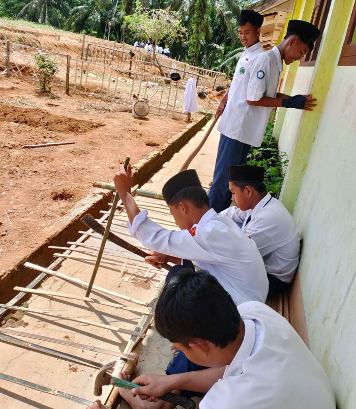 Tebo, Rimbo Mulyo , Semangat gotong royong dan kebersamaan tampak jelas di belakang ruang kelas 8B MTsN 4 Tebo. Di bawah terik matahari, para siswa kelas 8B bekerja sama mengolah lahan dan membangun pagar kebun dari bambu. Kegiatan ini merupakan bagian dari program sekolah yang bertujuan memperkuat ketahanan pangan di lingkungan sekolah.
