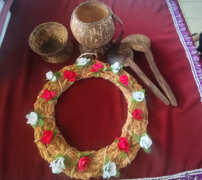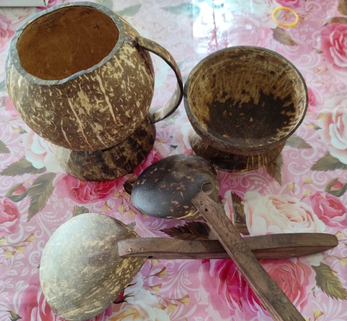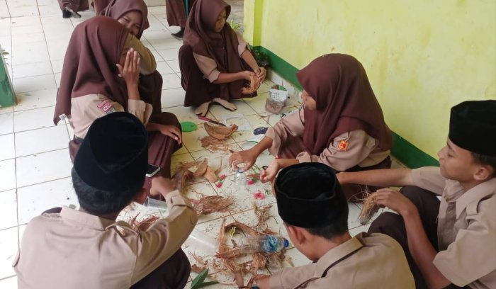 Melihat kondisi seperti ini salah satu guru Prakarya Ibu Yunia Fitriani, S.Pd mengajak perserta didik terutama kelas VIII untuk memanfaatkan limbah sabut kelapa yang ada.Ibu Yunia Satriani mengatakan bahwa dirinya mendapat inspirasi tersebut dari karya-karya seni yang di pamerkan. Aneka produk kerajinan tangan menyimpan potensi besar untuk menjadi karya yang menguntungkan. Tentu saja karya-karya nya harus yang unik dan menarik agar mampu menarik perhatian orang-orang. Salah satu kerajinan yang dibuat perserta didik adalah cangkir, bingkai foto, centong nasi, centong sayur.